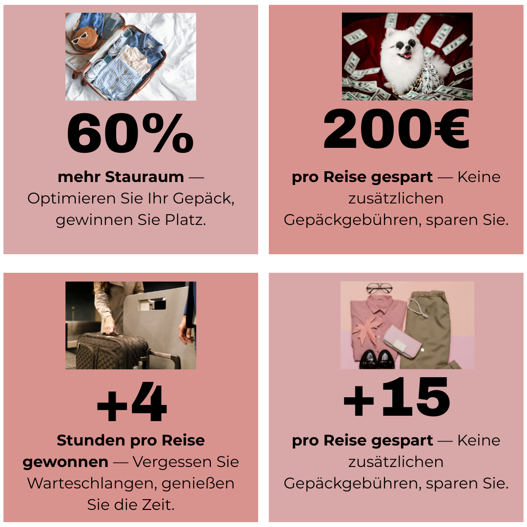Maksimer din pakkekapacitet og spar mere på hver tur! Med 60% mere plads, reducere bagagegebyrer, gem timer i lufthavnenog behold dit tøj rynkefri og friskRejs smartere og nyd hvert øjeblik.