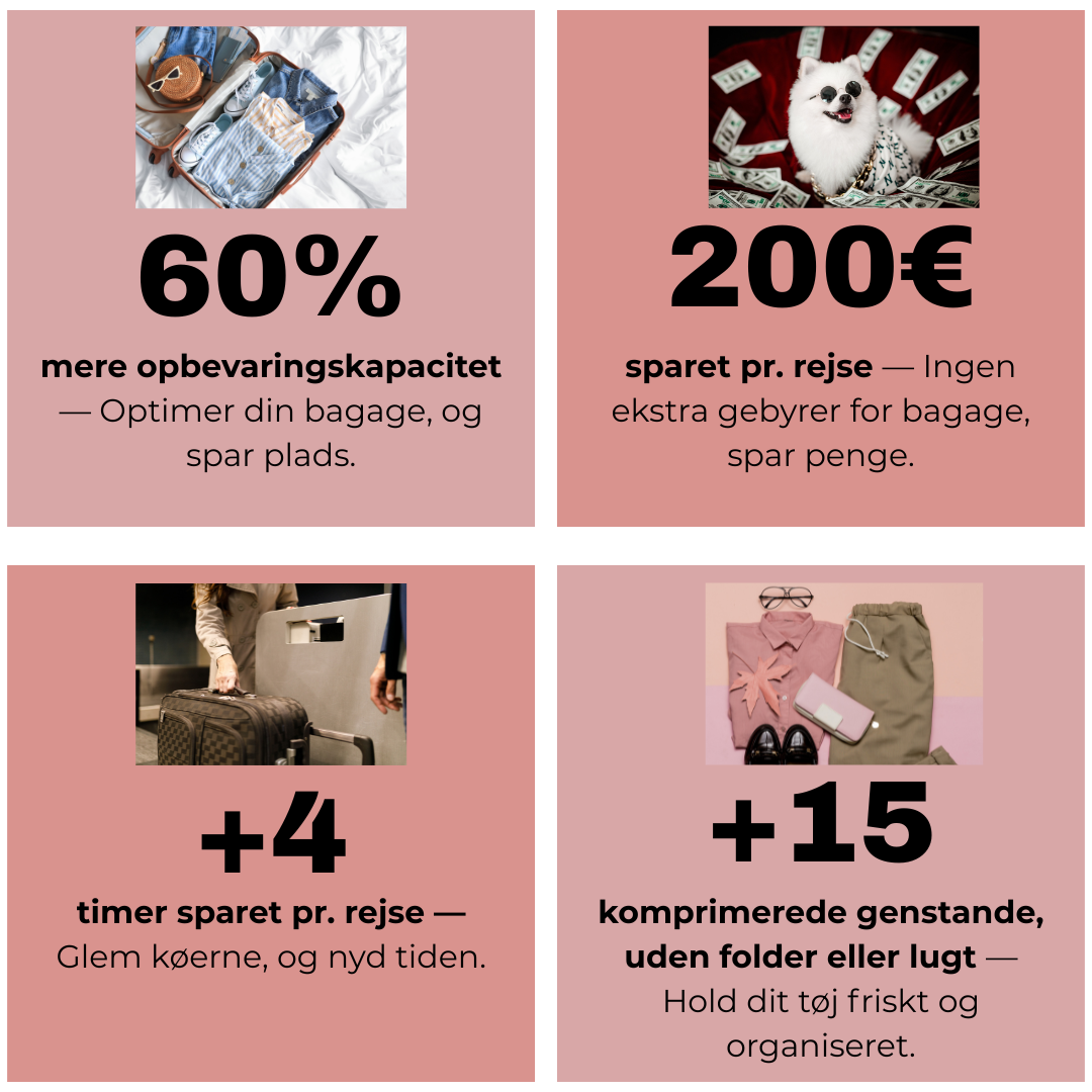 Maximize your packing capacity and save more on every trip! With 60% more space, reduce luggage fees, save hours at the airport, and keep your clothes wrinkle-free and fresh. Travel smarter and enjoy every moment.